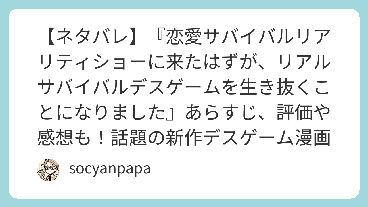 『恋愛サバイバルリアリティショーに来たはずが、リアルサバイバルデスゲームを生き抜くことになりました』は、新感覚の恋愛×デスゲーム漫画として注目の作品です。